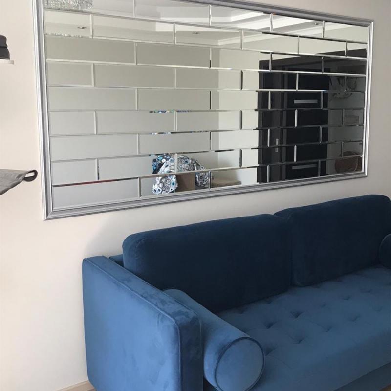 Для декора выбрана простая прямоугольная форма серебристой плитки. Вот почему зеркальное панно идеально вписывается в интерьер, который отличается чистыми, четкими линиями и оформлен в неярких пастельных тонах.