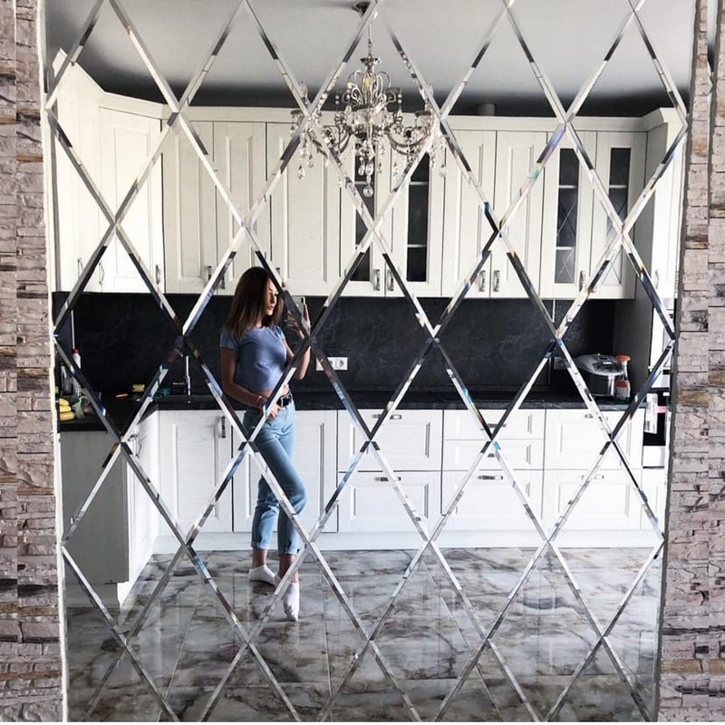 Использована квадратная серебристая зеркальная плитка размером 18х18.